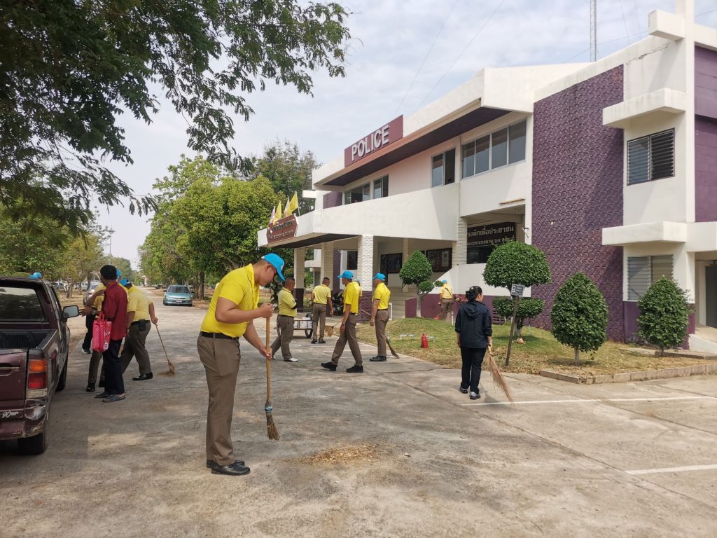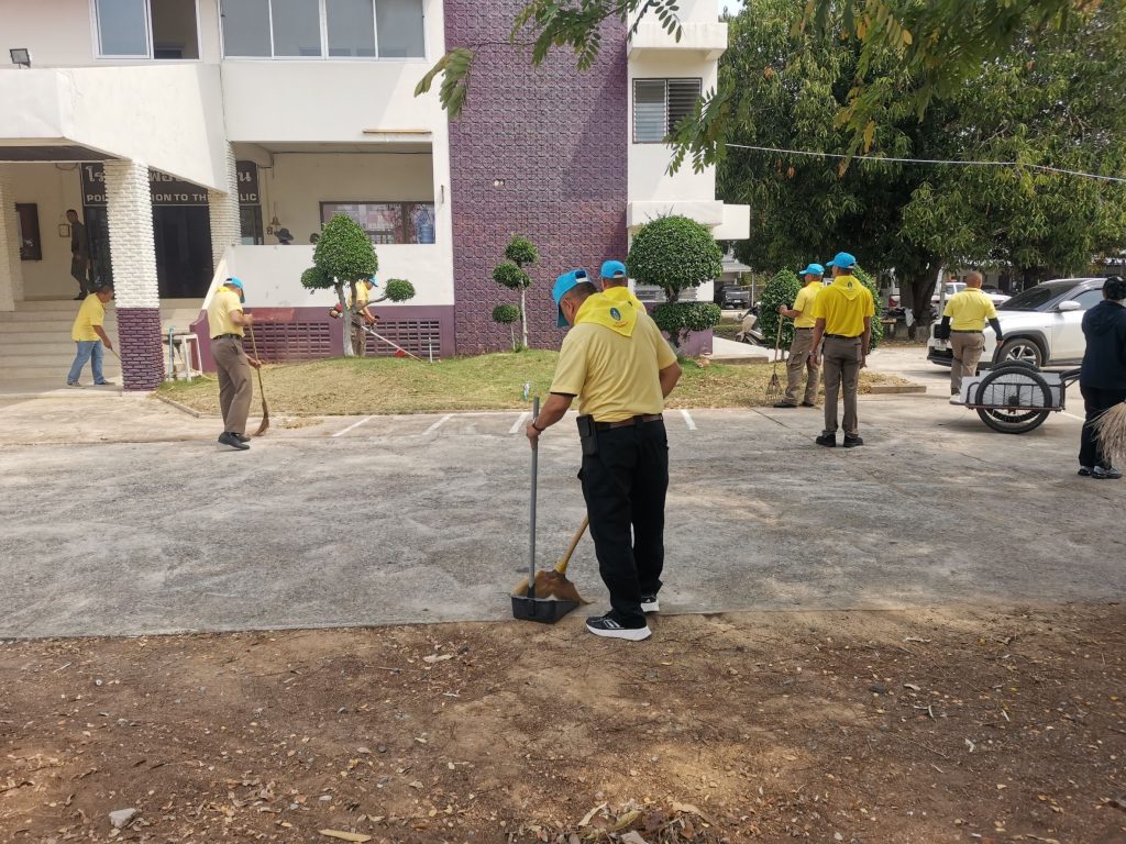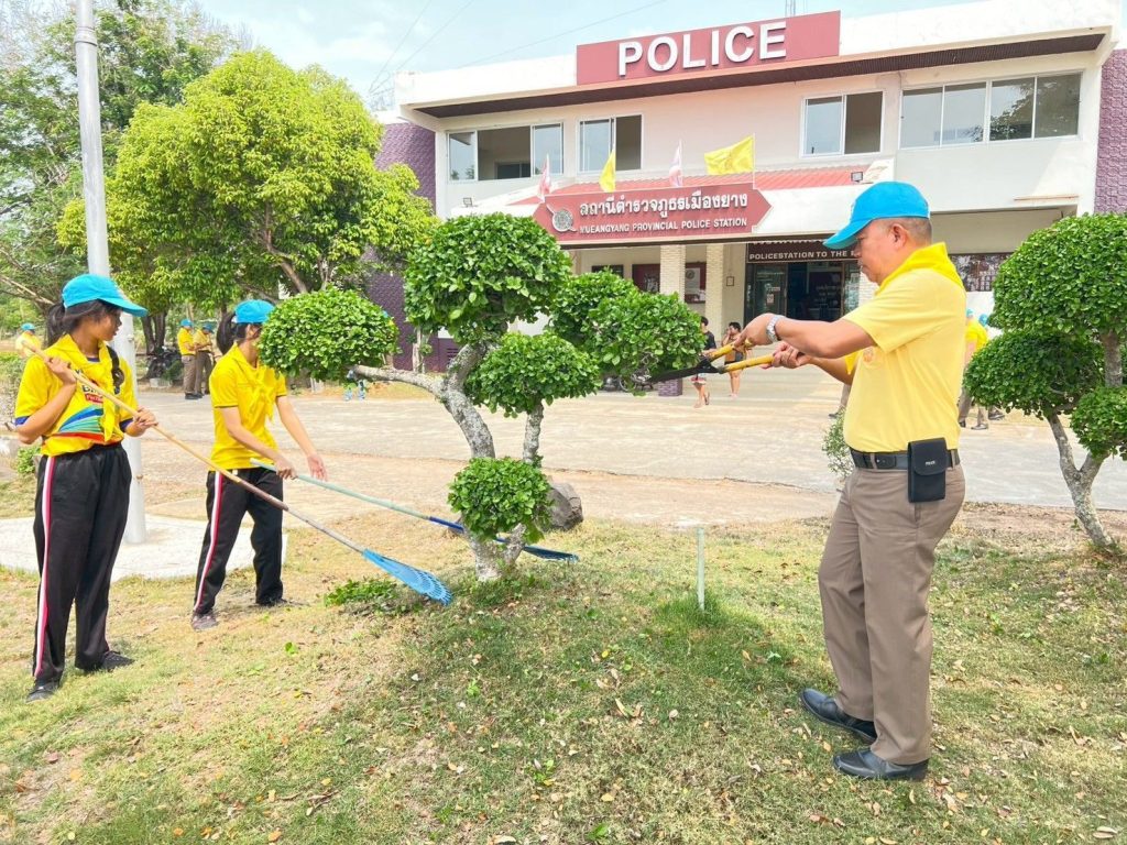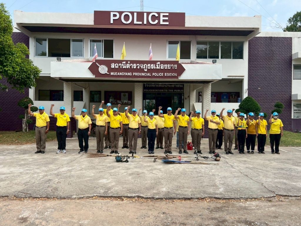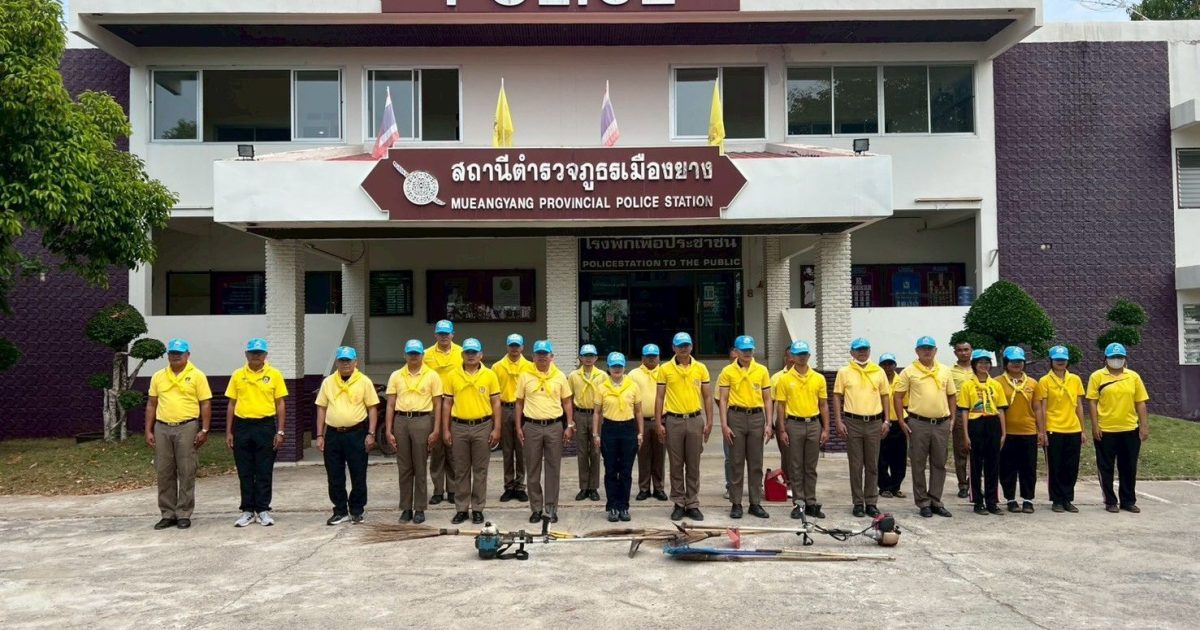 พ.ต.ท.ชานุโชค สืบค้า สว.สส.สภ.เมืองยาง,พ.ต.ท.หญิง ภัคจิรา กิ่งนอก สว.อก.สภ.เมืองยาง นำข้าราชการตำรวจ สภ.เมืองยาง จัดกิจกรรมจิตอาสา วันนี้เนื่องในโอกาสวันคล้ายวันพระราชสมภพ วันที่ ๒ เมษายน ๒๕๖๘ กรมสมเด็จพระเทพรัตนราชสุดา เจ้าฟ้ามหาจักรีสิรินธร มหาวชิราลงกรณวรราชภักดี สิริกิจการิณีพีรยพัฒน รัฐสีมาคุณากรปิยชาติ สยามบรมราชกุมารี ข้าราชการตำรวจจิตอาสาฯ ทำกิจกรรมจิตอาสาพัฒนา ปรับปรุงภูมทัศน์ ทำความสะอาดสถานที่ บริเวณลานหน้าสภ.เมืองยาง เสร็จแล้ว ผกก.ได้แจกข้าวกล่องและน้ำดื่ม เป็นอาหารกลางวันให้กับตำรวจจิตอาสาและนักเรียนฝึกงานจิตอาสาทุกคน