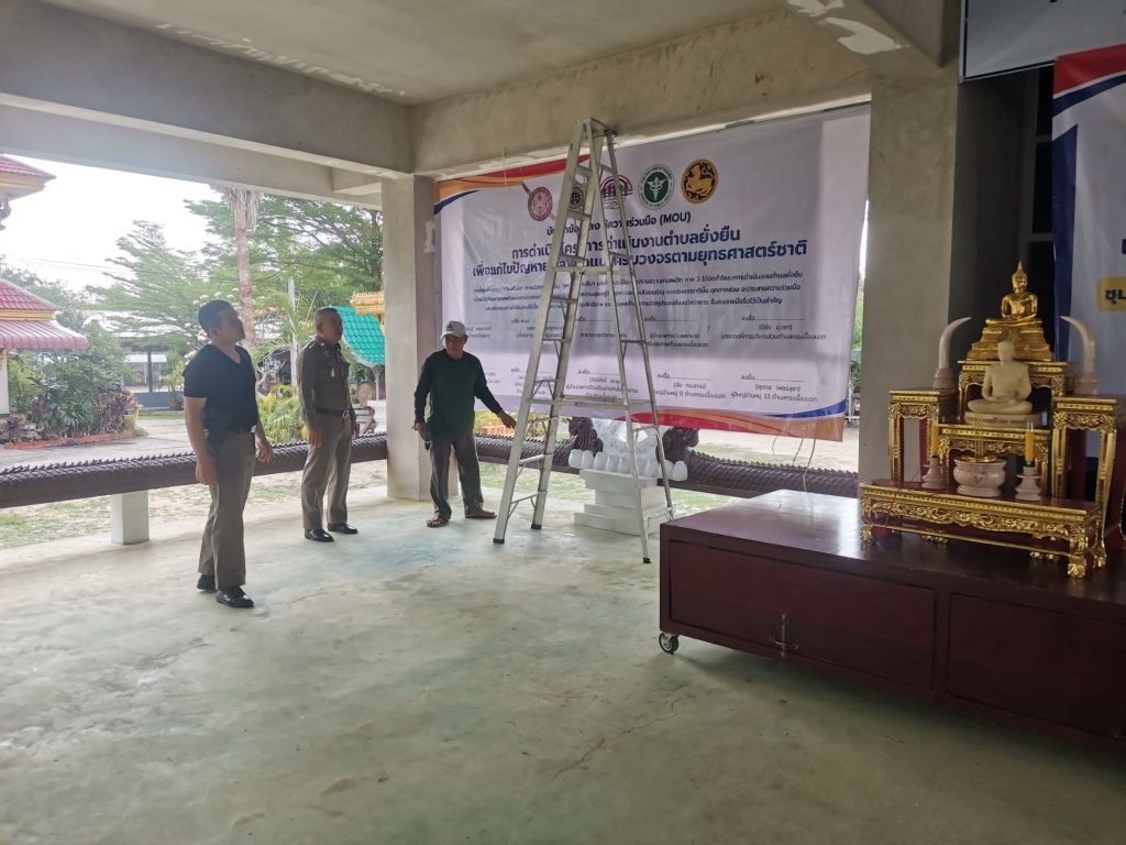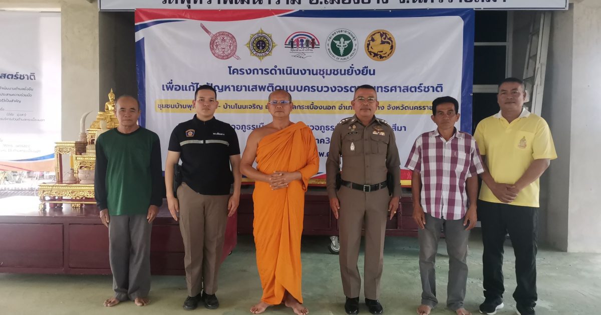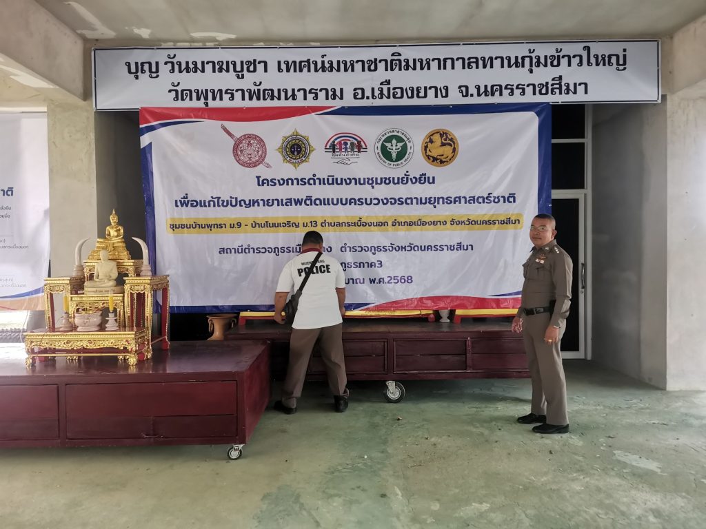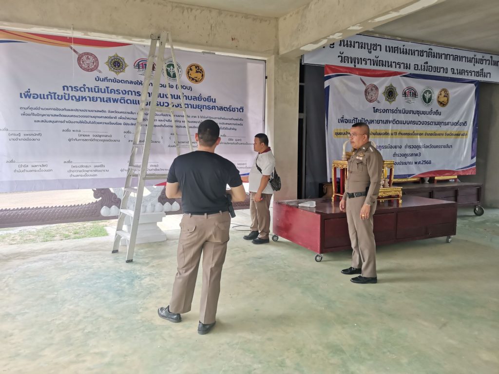 ร.ต.ท.สมพงษ์ อินภู่ รอง สว.(ป.)สภ.เมืองยาง พร้อมชุดปฏิบัติการชุมชนยั่งยืน ฯ พระปลัดสุนา อัคคธีโร เจ้าอาวาสวัดบ้านภุทรา พร้อมผู้ใหญ่บ้านบ้านพุทรา ร่วมกันจัดสถานที่เตรียมความพร้อมพิธีเปิดโครงการดำเนินงานตำบลยั่งยืนเพื่อแก้ไขปัญหายาเสพติดแบบครบวงจรตามยุทธศาสตร์ชาติ ประจำปี 2568 ในวันพุธที่ 12 มีนาคม 2568 ตั้งแต่เวลา 10.00 น. ณ ศาลาวัดบ้านพุทรา ต.กระเบื้องนอก อ.เมืองยาง จ.นครราชสีมา