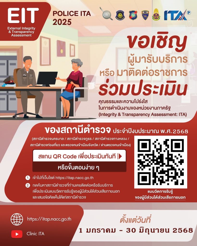 สถานีตำรวจภูธรเมืองยาง จังหวัดนครราชสีมา ขอเชิญชวน ผู้มารับบริการ / มาติดต่อ สถานีตำรวจ ร่วมจัดทำแบบวัดการรับรู้ของผู้มีส่วนได้ส่วนเสียภายนอก (External Integrity & Transparency Assessment: EIT) 2025 สำหรับนำไปพัฒนาปรับปรุงการให้บริการของสถานีตำรวจ ทำแบบวัดการรับรู้ของผู้มีส่วนได้ส่วนเสียภายนอกโปรดแสกน QR Code ด้านล่าง หรือคลิกที่นี่>>>